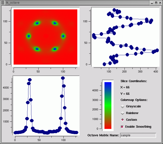 The only custom part in this widget is the code to grab an octave array and pass it to Tcl. Everything else was done entirely in just 200 lines of Tcl, using the existing BLT widget for displaying the axis, X/Y graphs and colormap index.
